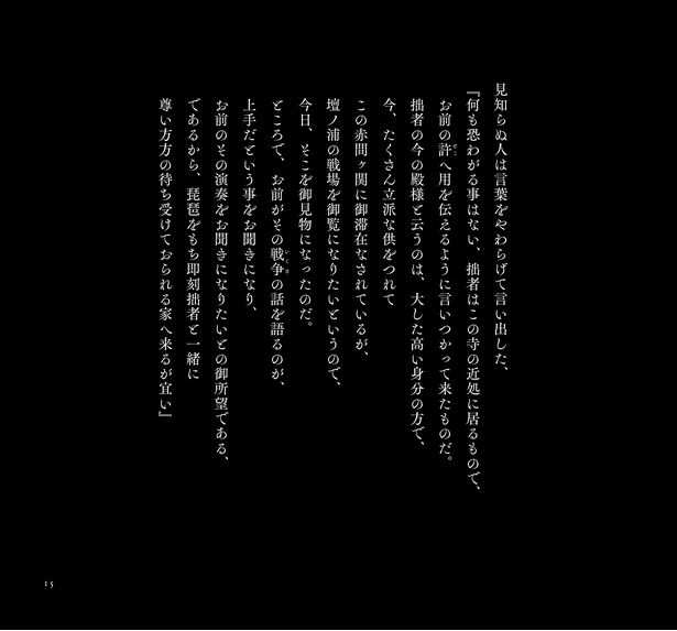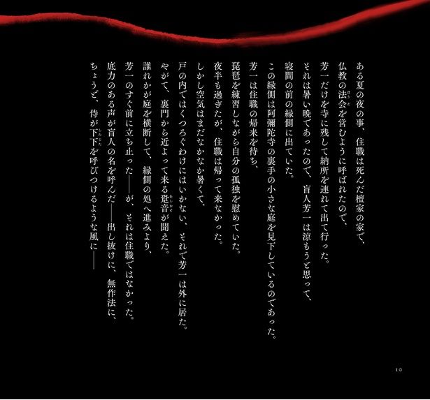 ある夏の夜、縁側で琵琶を練習していた芳一は、暮らしている寺の住職以外のだれかが