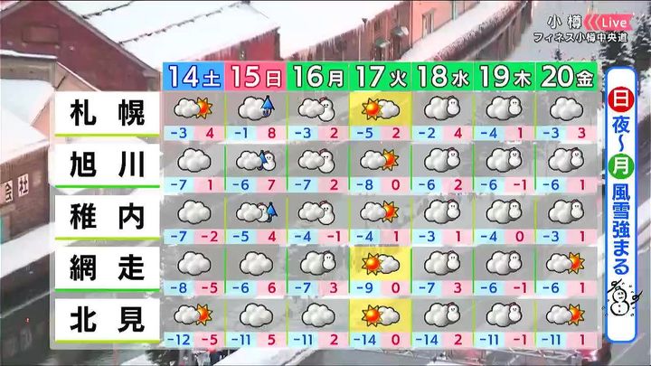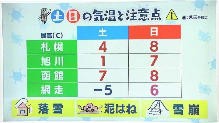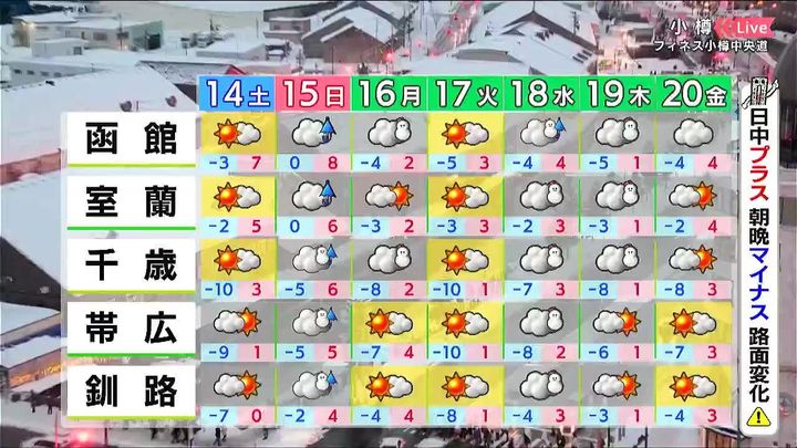 あす14日(土)は札幌で4度、函館は7度まで上がります。網走は‐5度と寒さが厳しいでしょう。日曜は各地で3月下旬から4月上旬並みの気温です。網走でもプラス6度まで上がり、旭川は7度、札幌と函館は8度です。気温は上がりますが、屋根からの落雪や泥はね、傾斜地でのなだれなどに注意が必要です。
