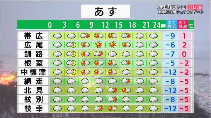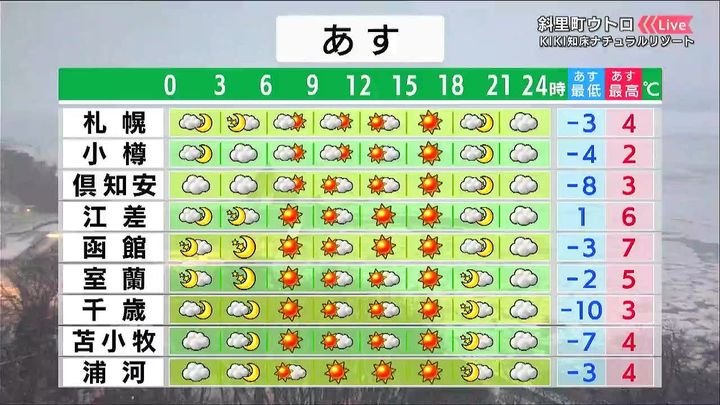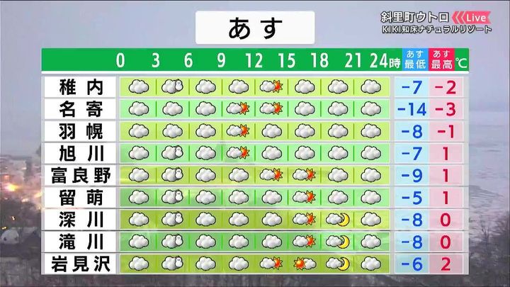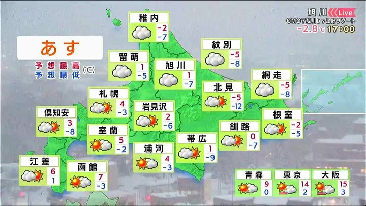 雪はやんで、広く日が差すでしょう。気温はきょう13日(金)より高く、倶知安でもプラス3度です。一方、流氷を渡る冷たい風が吹くオホーツク海側は‐5度くらいで、きょうより寒さが厳しくなります。