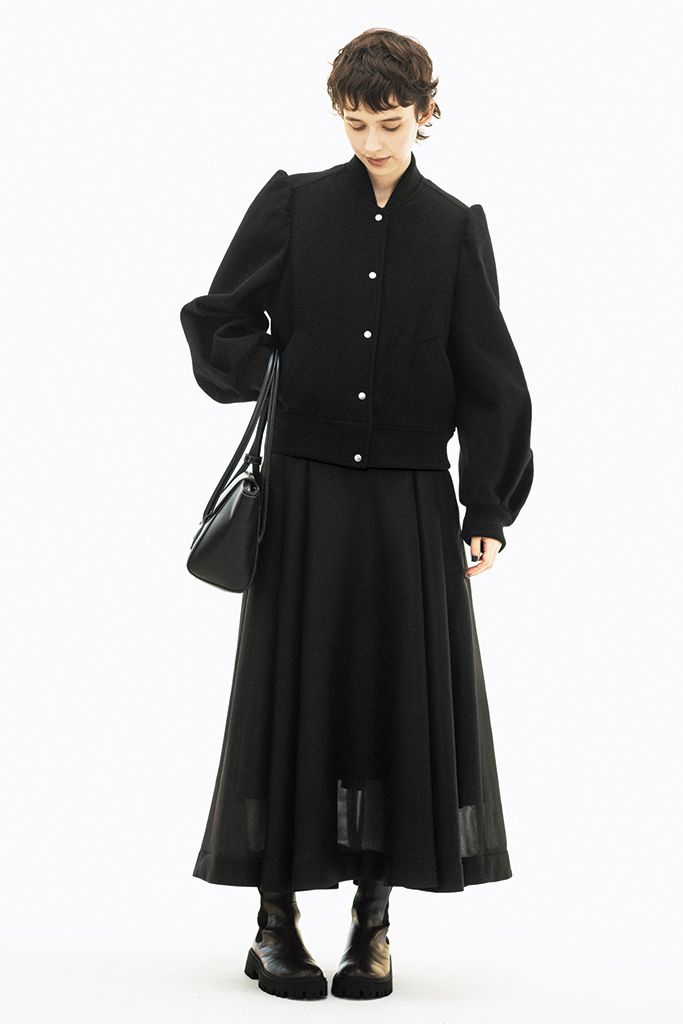 スポーティなデザインをとり入れて、オール黒を軽快に。コンパクトな形+パフスリーブによりブルゾンのレディな印象が高まって、キレイめな装いにもハマる1枚。ふわりとゆれるフレアスカートを組み合わせればさらに軽やか。