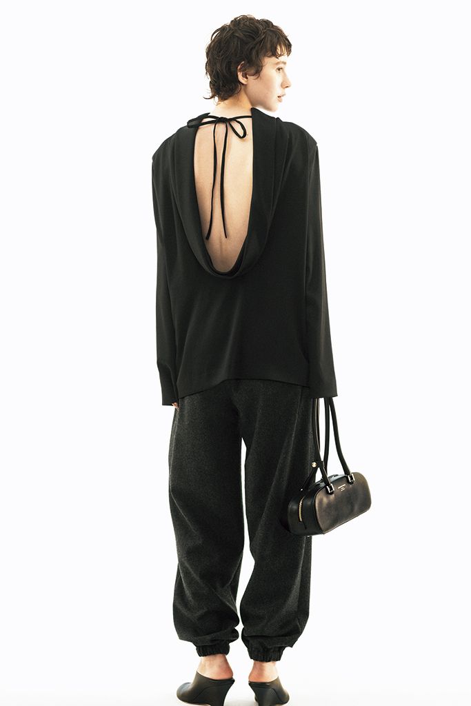 起毛感のあるフラノ素材のリラックスパンツをエレガントに導く落ち感サテン。フロントは首つまりのミニマルなデザインながら、深く開いた後ろ姿でおとなしいだけでは終わらせない強さも加算。黒×チャコールのわずかな色の差もポイントに。
