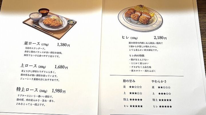 お肉170gの並ロース(1380円)、200gの上ロース(1680円)、240gの特上ロース(1980円)、そしてヒレ150g(2180円)というラインナップ。