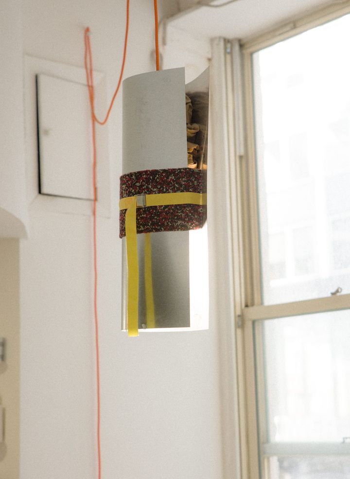 ラフ・シモンズのファブリックを用いたガルザ(GARZA)のライト。もともとはオレンジだったベルトは時間とともにやわらかく変色。その経年の表情もまた味わいとして楽しんでいる。 OMI TANAKA