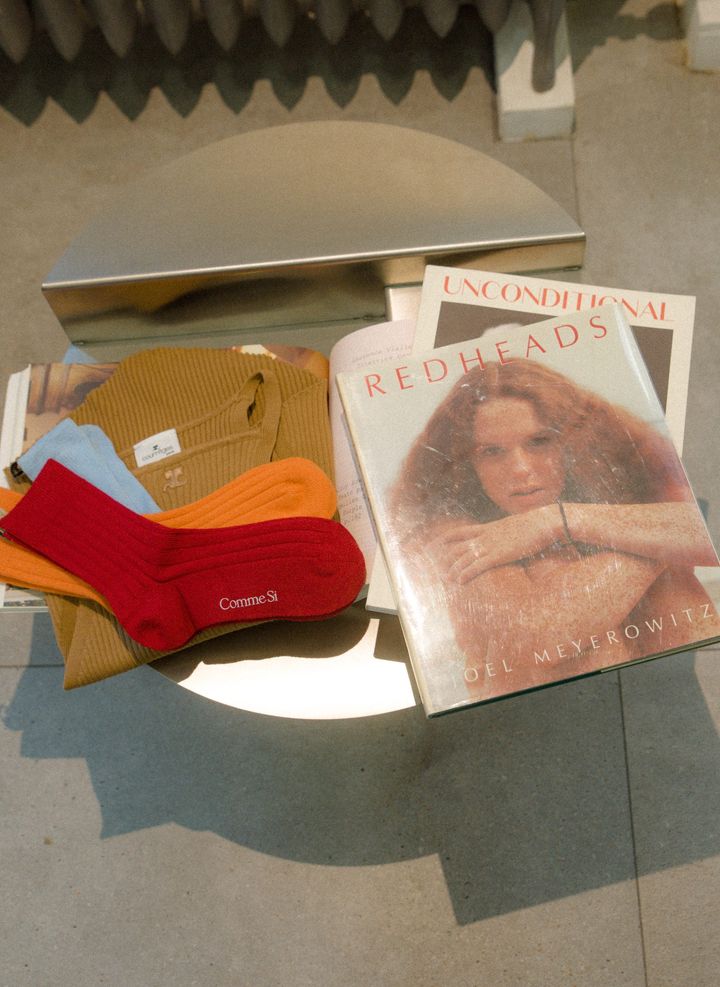 クレージュ(COURRÈGES)やコム シ(COMME SI)など、ブランドの色使いから洋書のヘアまで。視覚のインスピレーションが、そのままクリエイションにつながっていく。 OMI TANAKA