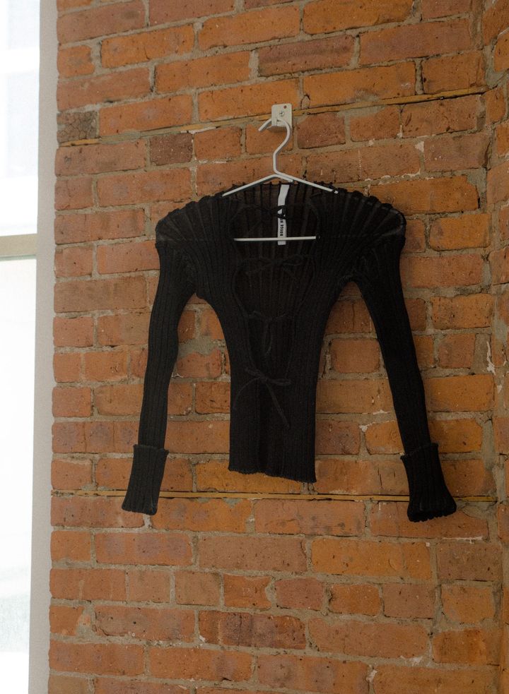 さりげない肌見せが女性らしさを感じさせる、デンマークのブランド、エ ローエ ホーベ(A. ROEGE HOVE)のカーディガン。他にも、アウェイク モード(A.W.A.K.E. MODE)やコペルニ(COPERNI)を愛用。 OMI TANAKA