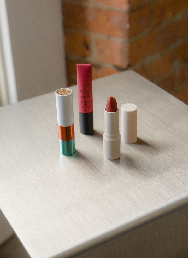 サニーズ フェイス(SUNNIES FACE)、エルメス(HERMÈS)、ナーズ(NARS)の赤のリップ。その日のスタイルに合わせて、さりげなく表情を切り替える。 OMI TANAKA