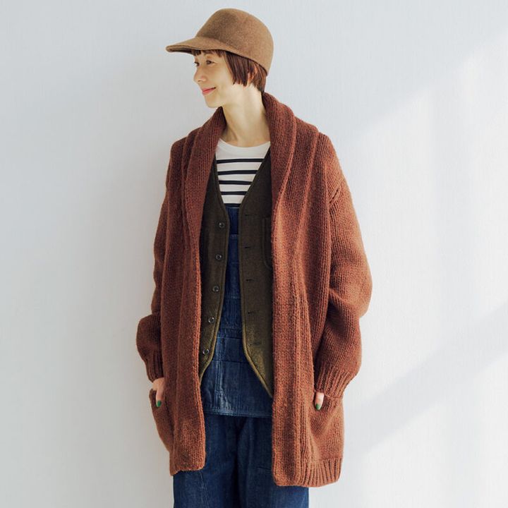 胸から腰まわりをすっぽりカバーしてくれるサロペットは、味方につけたいアイテム。ブラウンのニットガウンに、カーキのジレを挟んで。