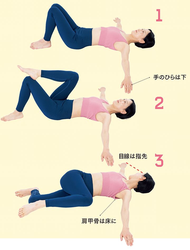 1. 仰向けになり、両足を揃えて膝を立てる。両手は手のひらを下に向け、肩の高さに真っすぐ伸ばす。