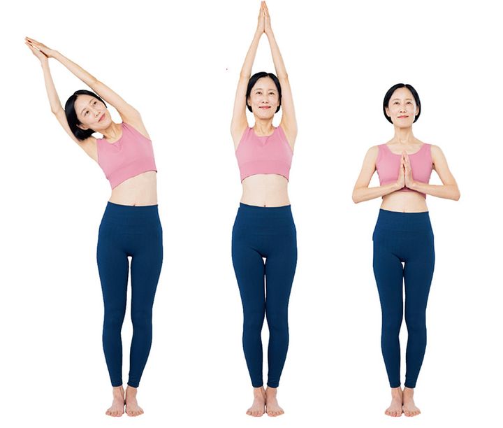3. 合掌したまま、息を吐きながら上体を右に倒し、5呼吸キープ。このとき上体が前傾しないように意識して。反対側も同様に。
