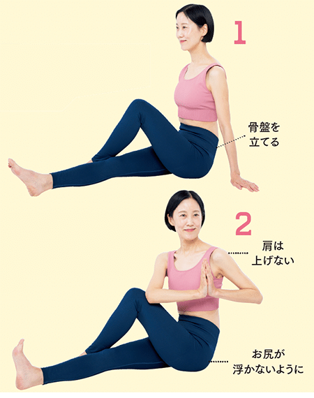 2. 上体をねじり、右肘を左膝の外側に当て、息を吸いながら腰と背中を伸ばす。息を吐きながら合掌し、5呼吸キープ。反対側も同様に行う。