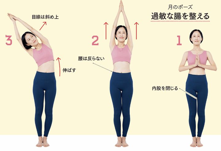 体側(脇の下から腰の側面)を伸ばして、背骨全体のこわばりをほぐすことで、自律神経が整い、腸の働きも良好に。