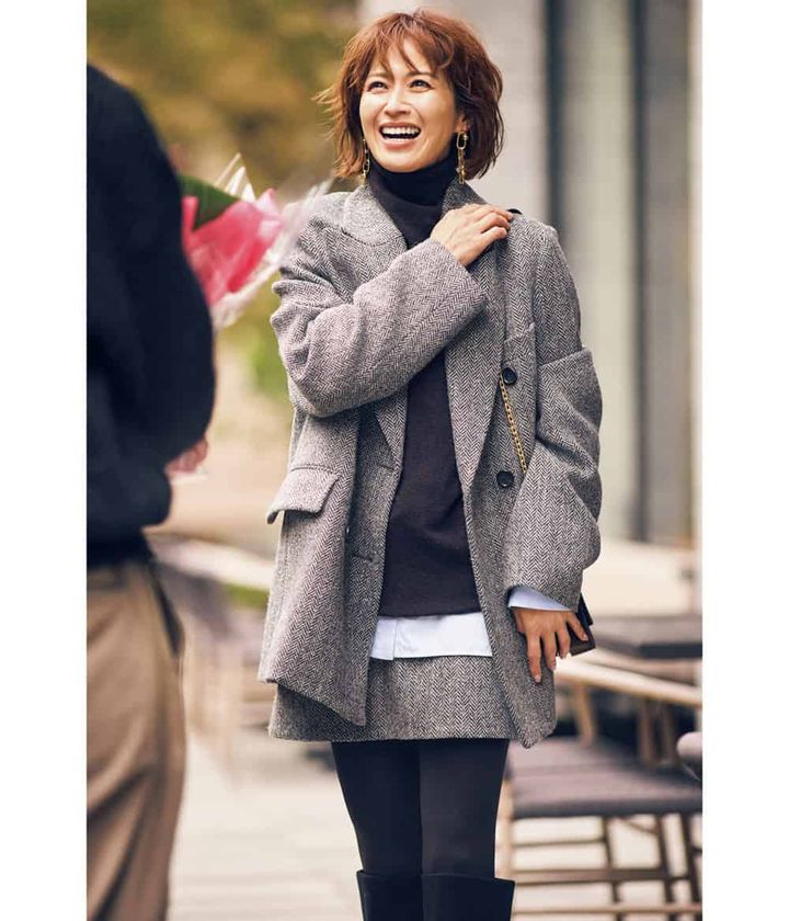 週末に多くなった夫婦ランチは気負わないミニのセットアップで。落ち着いたグレーのヘリンボーンと、ビッグシルエットのジャケットとの甘辛バランスでミニスカートも大人に着地。ニットの裾からチラ見せしたシャツが小面積でもほどよいアクセントに。