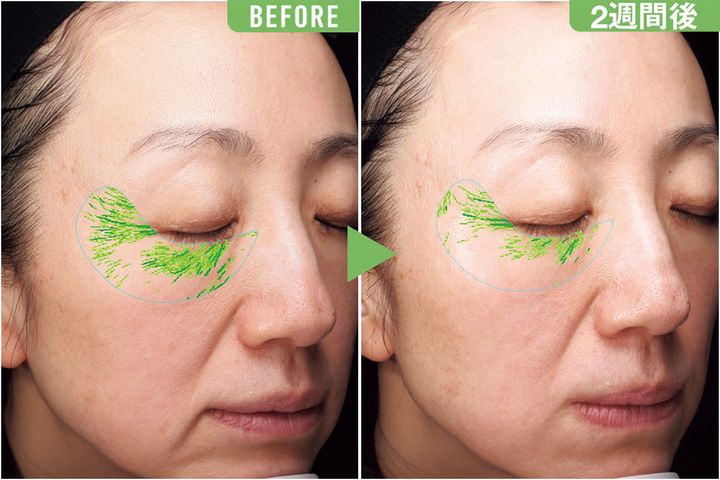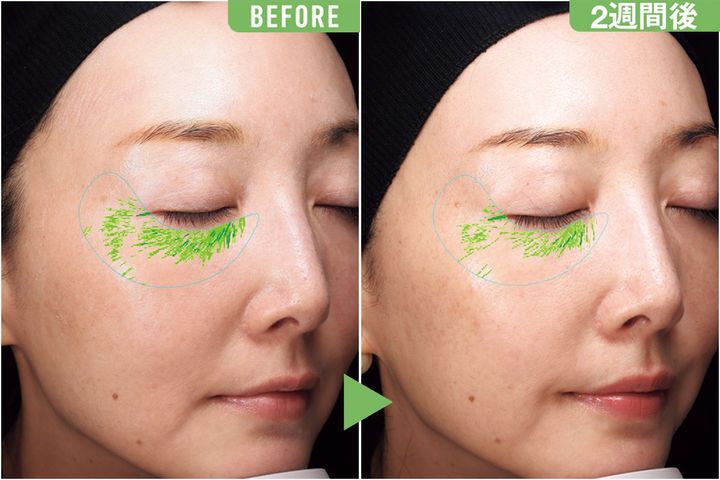 くすみと目の下のたるみが軽減し、目の開きもアップ。目元がしっかり保湿され1週間後には目まわりの小ジワが浅くなった実感も。VISIAでも効果が裏付けられ目元のシワの改善が顕著に現れた結果となりました。