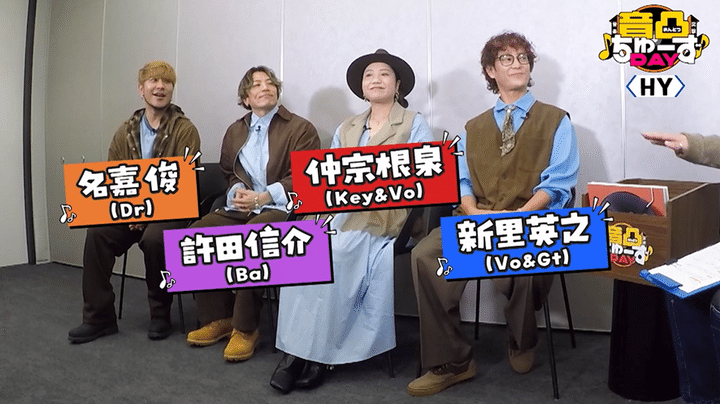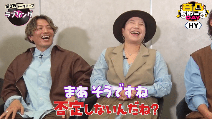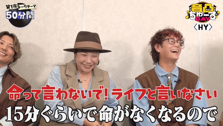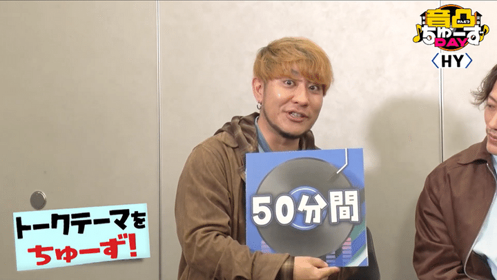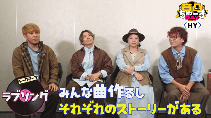トーク冒頭、HY公式YouTubeサブチャンネル「HYのクレームは一切受け付けません!!」に乗っかる形で「(トークテーマの書かれたレコードを)1枚ずつ“ちゅーず”して答えてください。クレームは一切受け付けません」と話すMC下埜に、メンバーは「YouTube見てらっしゃいますね?」「見てくれてる! 嬉しい~」と笑顔に。
