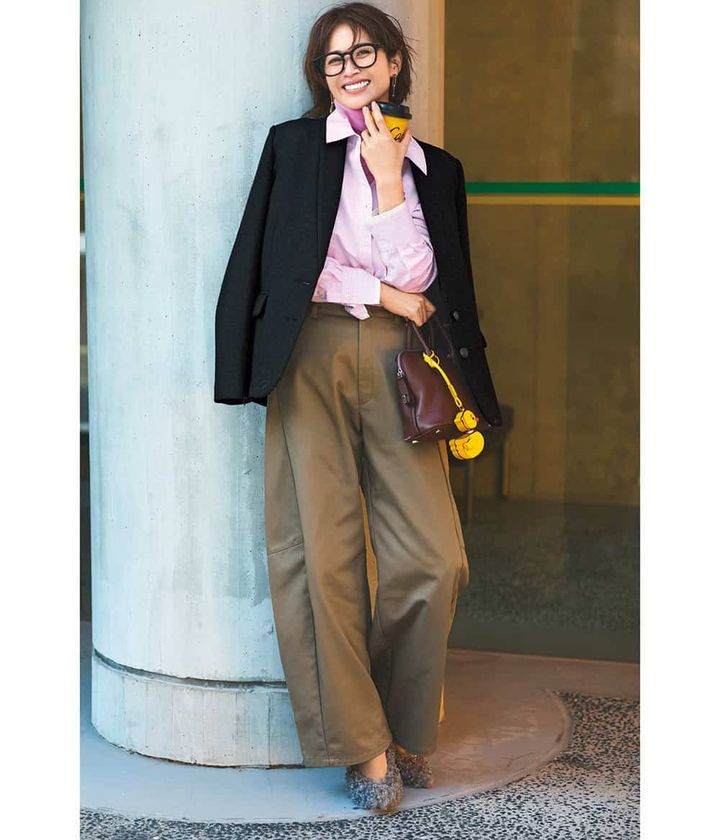 ジャケット¥50,600(カデュネ)シャツ¥17,600(アプワイザー・リッシェ)ニット¥49,500(デパリエ/デパリエ 伊勢丹新宿店)パンツ¥31,900(ハイク/ボウルズ)バッグ¥561,000バッグチャーム¥111,100(ともにヴァレクストラ/ヴァレクストラ ジャパン)パンプス¥31,900(プランクプロジェクト/プランクプロジェクト 青山店)ピアス¥39,600(ブランイリス/ブランイリス トーキョー)メガネ¥40,700(プロポ/プロポデザイン)ネックレス¥23,650(ココシュニック オンキッチュ/ココシュニック)