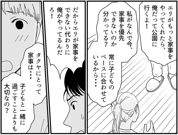 エリはお願いした家事すらちゃんとできない。俺は別にそれで怒ったりしないし、代わりにフォローしてやっている。エリがやらない分の家事を俺がこなしているんだから、そのうえ「子どもと遊びに行く」という仕事まで増やさないでほしい。
