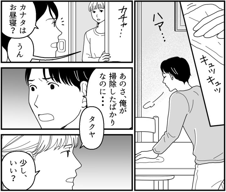 俺(タクヤ)は、妻のエリと2才の息子・カナタを育てている。エリが職場復帰を果たしてから、わが家は大忙しな日々。エリは家事能力が低く、何をしてもいつも中途半端。一方で俺はもともと家事は好きだし得意な方だ。休日は俺が家事に集中することが、家庭にとっても最善だと思っている。しかし今日は掃除したばかりの部屋で、カナタに食事をボロボロこぼされた。本当にイライラする……。俺はため息をつきながら汚された場所を片づけていた。