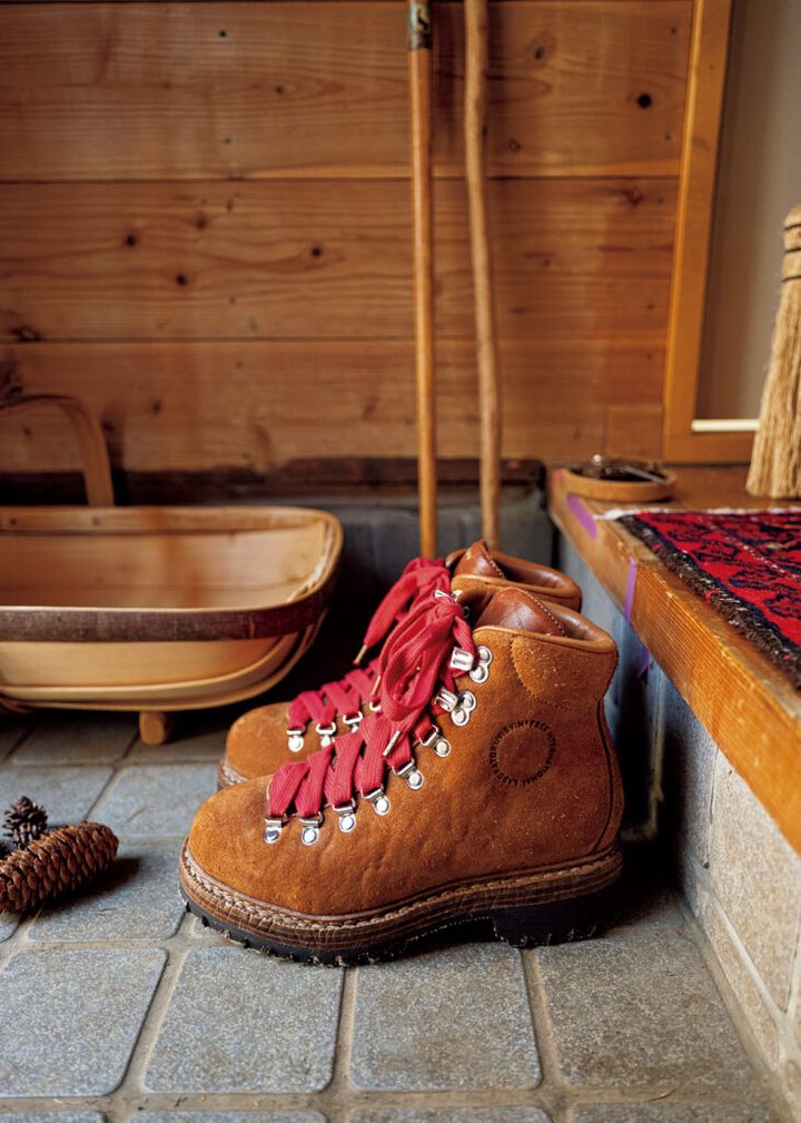 鮮やかなシューレースを結ぶたびに心が躍って、外の寒さを忘れる〈WMV〉のブーツ。登山靴のような武骨さがありながらも、植物タンニンで鞣されたレザーの豊かな表情やロゴの刻印など、ディテールの作り込みに何度見ても惚れ惚れする。中敷きにはコルク素材を使用しているから履きこむほどにフィット感が増すし、地面をがっちりと摑むビブラムソールのおかげで何かと危なっかしい冬道でも安心。ソールは張り替えも可能。¥231,000(ダブリュー エム ブイ ビズビム トウキョウ 03−6303−3717) その他スタイリスト私物