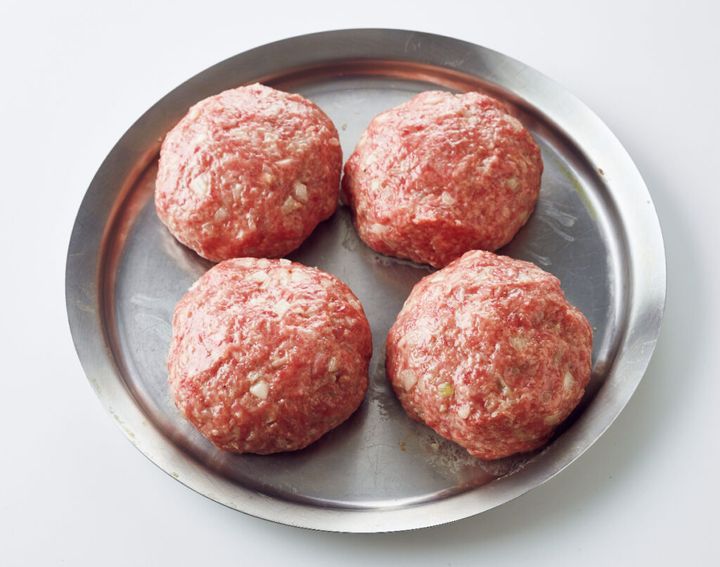 (1)玉ねぎは1/2量は粗いみじん切りに、残りは縦に薄切りにする。マッシュルームはあれば石づきを切り、縦に薄切りにする。ボールにひき肉と〈A〉、玉ねぎの粗いみじん切りを入れ、粘りが出るまで混ぜ合わせる。4等分にし、直径7cmくらいの円形に整える。