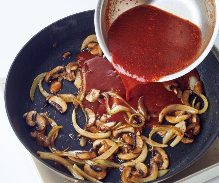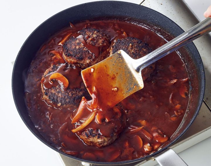 (2)フライパンにサラダ油を中火で熱し、ハンバーグを並べる。両面を2~3分ずつ焼いて取り出す。フライパンに残った脂を少し拭き、玉ねぎの薄切りとマッシュルームを入れ、しんなりとするまで炒める。〈B〉を加えて1/2量強になるまで中火で煮つめる。