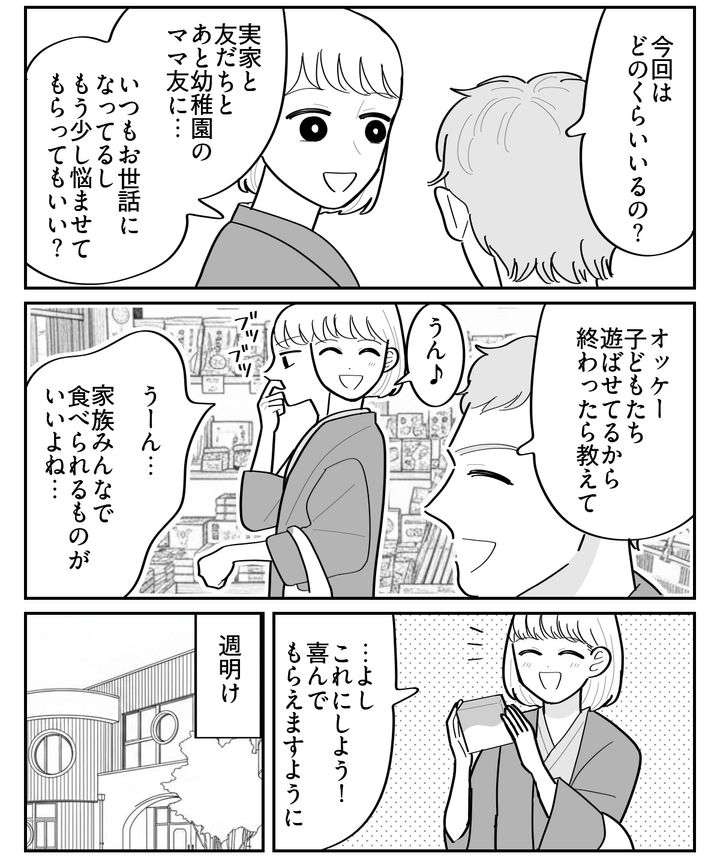 私はツグミです。夫のトモヤと息子たちとの4人暮らしです。私たち夫婦はもともと旅行が大好き。この連休はドライブを兼ねて、小さい子どもがいても楽しめるファミリー向けの温泉施設にやってきました。私たちは温泉に浸かれて大満足、子どもたちも喜んでくれてよかったです。そして帰り間際、私は売店でのお土産セレクトに時間を取りました。実家用、友人用、幼稚園のママ友用……。相手の顔を思い浮かべながら選ぶのも楽しいひとときです。