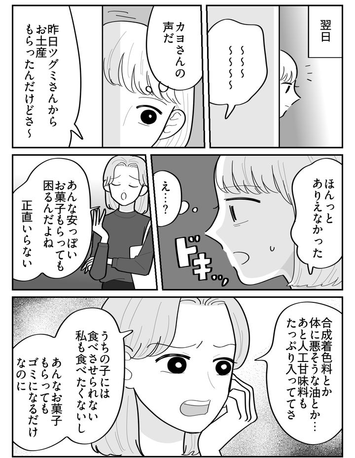 子どもを幼稚園に送り届けて帰ろうとすると、よく知るママ友たちが話している声が耳に入りました。ひと言挨拶していこうと思い近寄った私は、カヨさんの言葉を聞いて凍りつきます。カヨさんは明らかに私が渡したお土産のことをディスっていたのです。