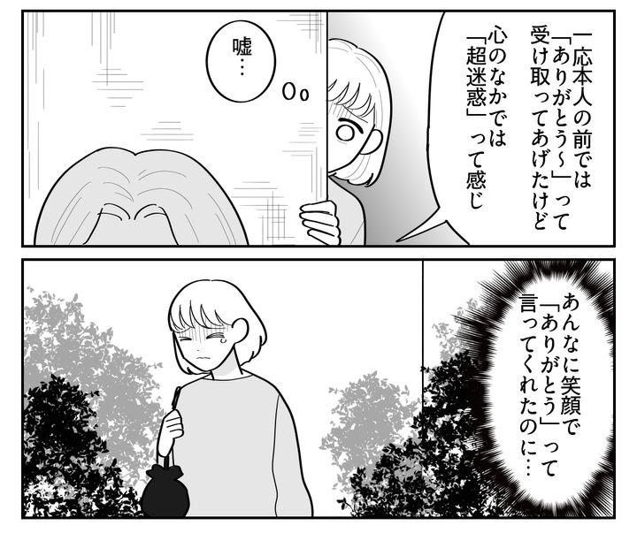 カヨさんの口から出たのは「安っぽい」「いらない」「超迷惑」という愚痴のオンパレード。心を込めて選んだお土産は、まるでゴミのように思われていたのです。あのときは笑顔で「ありがとう」って言って受け取ってくれたのに……?