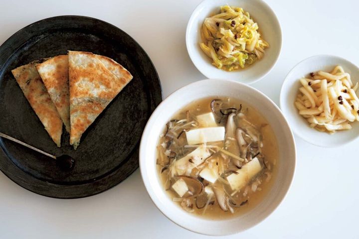 甘味をしっかり蓄えた白菜は香り漬けに。万能ネギをたっぷり入れた薄餅、ショウガと干し椎茸で作る滋味深いスープで元気に。