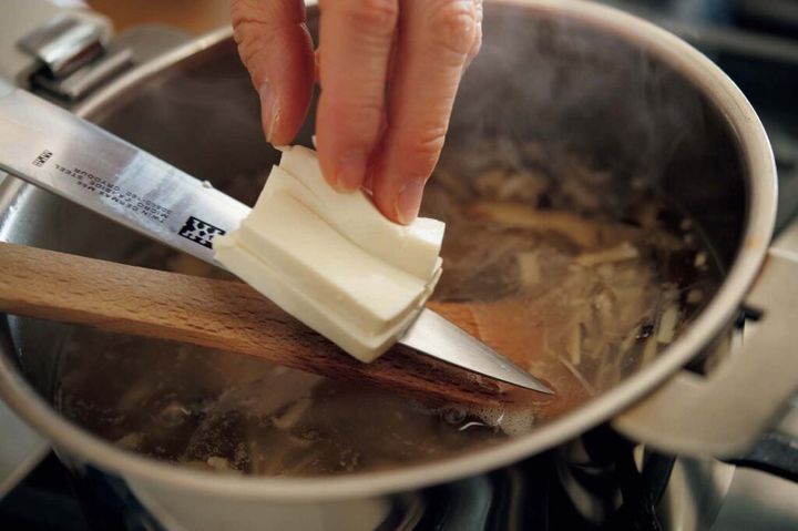 薄切りにした絹豆腐は崩れやすいので、最後に加えてさっと温める。