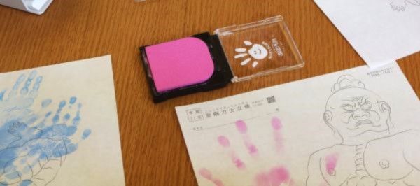 とーはくの作品に親しみながら台紙にてがたを押して作る「とーはくてがたアート」。 訪れた日は、台紙のモチーフは、本館11室の《金剛力士立像(こんごうりきしりゅうぞう)》と、耳が生えた亀の図柄《夜着 紅綸子地橘扇亀模様(よぎ べにりんずじたちばなおうぎかめもよう)》(江戸時代・19世紀)の2種類が出ていました。
