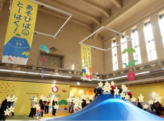 会場中央の山型遊具「とーはくふじ」では、頂上めがけて我さきに駆け上がり滑り降りる子供たちの歓声と元気いっぱいの姿にいつもとは違うとーはくを感じました。 「はつゆめボールプール」の中には鷹や茄子などの縁起の良いモチーフが隠されています。子供たちはボールプールにダイブしたり、見つけたモチーフで賑やかに遊んだりしていました。