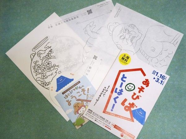 左から、重要文化財《色絵月梅図茶壷》塗り絵、「とーはくてがたアート」台紙、その他パンフレット 「あそびば とーはく!」 東京国立博物館[/caption]