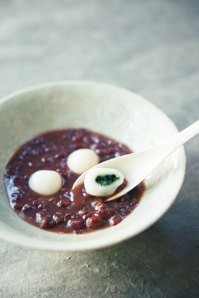 御菓子丸では七草から小豆に風味の合う草を三つ選んで、善哉(ぜんざい)に添える。セリ、ナズナ、ハコベ、それぞれをペースト状にし、白玉の中に入れる。白玉を食むと、中から緑色のペーストが出てくるという仕組み。一つずつの草の風味を味わうことができるので、この草はこんな味だったんだと体感することができる。ふっくらと炊き上げた小豆の風味に乗せた三草を体内に入れ、今年も元気に過ごせますように。