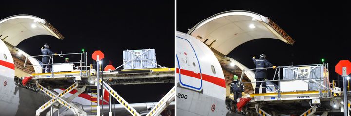 シャオシャオ(左)とレイレイが入った輸送箱を成田空港で搭載。(提供:(公財)東京動物園協会)