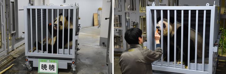 練習の成果を発揮してか、双子はすぐ輸送箱に入った。ただ、輸送箱の中でやや興奮気味になったので、これから長時間を輸送箱の中で過ごすことも考慮して、それぞれに鎮静剤を投与した。麻酔はしていない。ニンジン、リンゴ、パンダ団子も少し与えた。