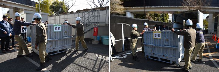 シャオシャオ(左)とレイレイが入った輸送箱をトラックへ。(提供:(公財)東京動物園協会)