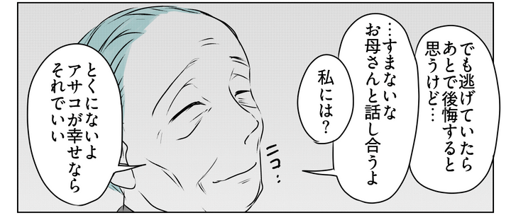 父はあらためて母と話し合うそうです。私には何かないかと聞くと、「アサコが幸せならそれでいい」と言われました。久しぶりに見た父の笑顔に驚きつつ、父の思いやりに感動しました。