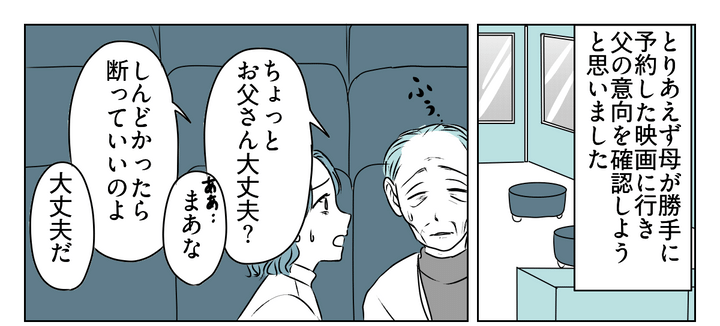 映画館での父の様子は、明らかにしんどそうに見えます。しんどかったら断っていいと言うと、「大丈夫だ」と言いますが……。