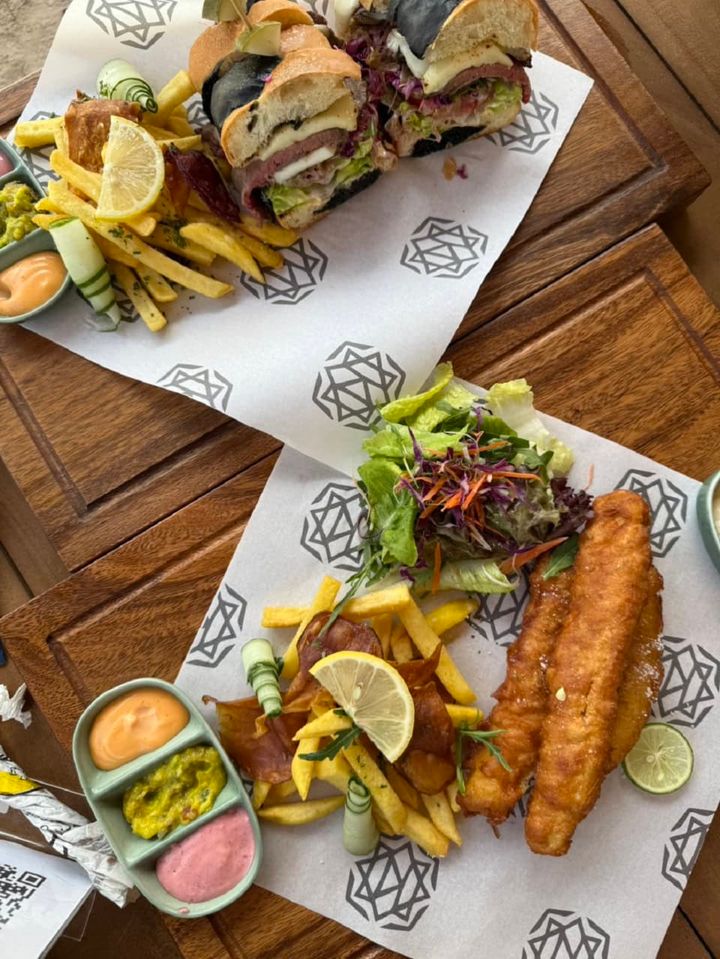 こちらは新しくできた『KLEO BEACH CLUB』というビーチレストランで食べたフィッシュ&チップスとバーガー。ビーチで食べるこういうご飯って最高!