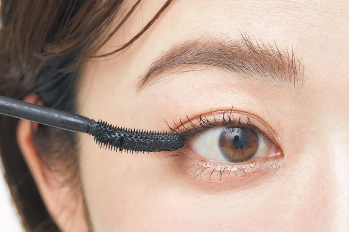 マスカラのヘッドで目尻までたっぷり塗布を。まつ毛をしっかり上げて塗ると、重みも気にならなく。