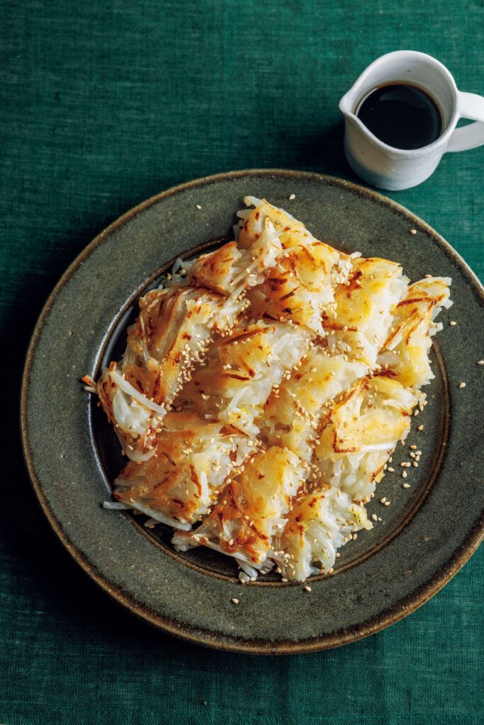 (2)フライパンにサラダ油を中火で熱し、(1)を流し入れる。木べらで丸く形を整え、4~5分焼いて上下を返し、さらに4~5分焼く。食べやすく切って器に盛り、ごまをふる。〈B〉を混ぜて添え、つけていただく。