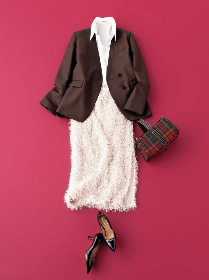 スカート¥26,400(ザ ポーズ/ウィム ガゼット ルミネ新宿店)シャツ¥30,800(ウィム ガゼット/ウィム ガゼット 玉川髙島屋S・C店)ジャケット¥52,800(アルアバイル)バッグ¥53,900(ア ヴァケーション/ノーベルバ)パンプス[参考価格]¥132,000(サントーニ/リエート)