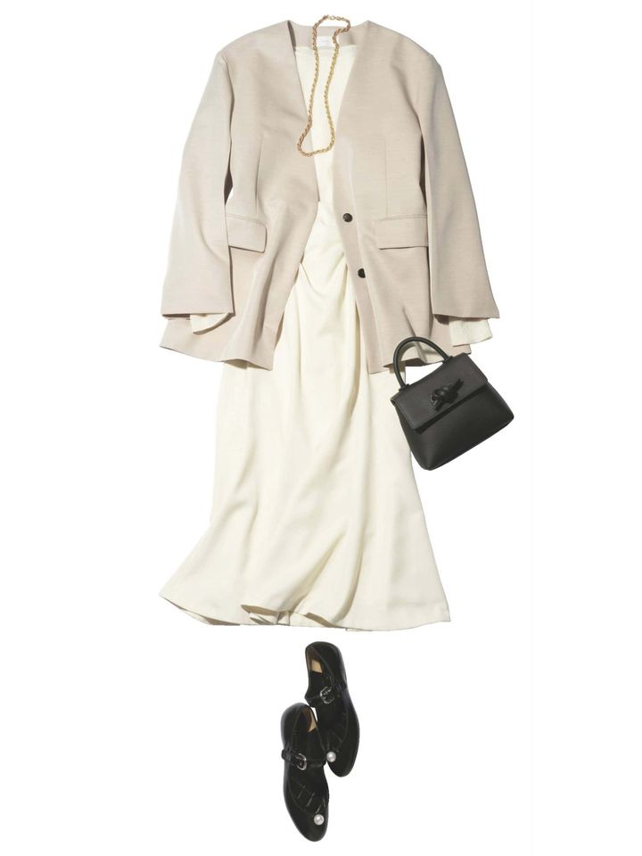 花びらのようなクチュールデザインが春の景色に溶け込みます。ロングよりやや短めのミモレ丈なので白面積が控えめになり、甘すぎ回避◎。黒アイテムに挟み込んでシックにまとめるのが大人流の着こなしです。