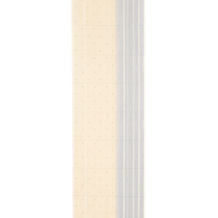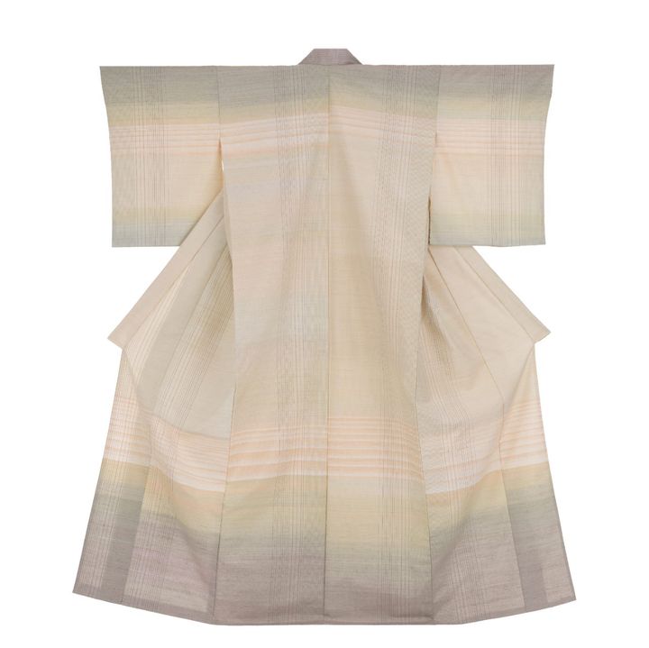 <strong>●本場結城紬「四拍子」</strong>ベージュとグレーを半身に取り、絣・縞・ぼかし・横縞を合わせてデザインし、淡い地色で織り上げています。着尺/<a href="https://www.takashimaya.co.jp/" target="_blank">高島屋</a> 写真提供=高島屋