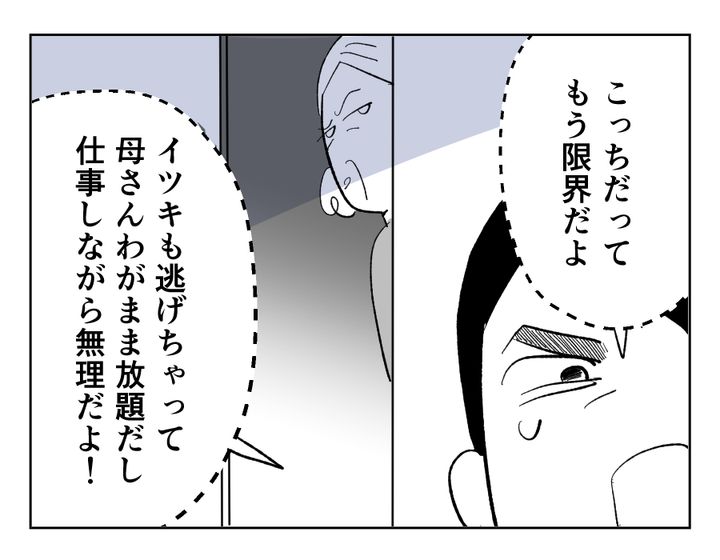 コウタさんは50代の会社員。同居で疲れきってしまった兄の妻(義姉)を助けるため、2週間、実母を自宅で預かることにしました。当然、滞在中は妻・イツキさんにすべてのお世話を……と思っていたのですが、イツキさんに逃げられて自分がお世話をすることとなり、2日目にして親子ゲンカ勃発。5日で実母を帰らせることになりました。