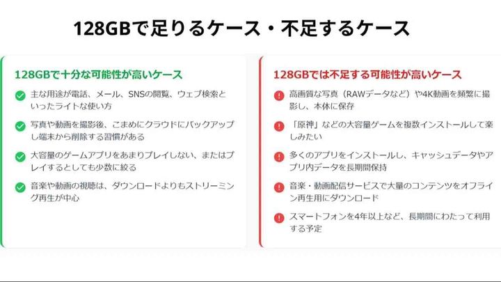 特に動画撮影やゲームをする場合、256GB以上を選ばないと、保存データを整理する手間に追われることになります。長く快適に使うなら余裕を持った容量選びが重要です。