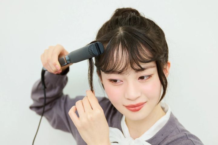 顔まわりはストレートアイロンで毛先が内に向くようにゆるく波巻きにする。前髪もふんわりしたカールになるように根元から熱をあて、顔まわりとのつながりを意識して。
