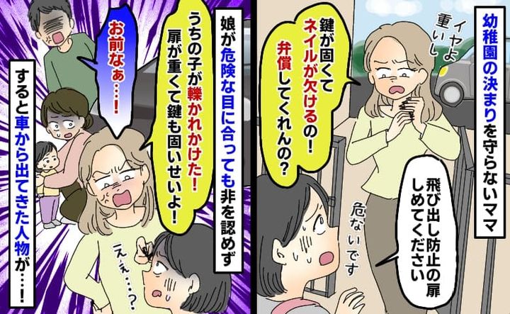 私はとっさに「危ない!」と叫びながら、Aちゃんの腕をつかみ、Aちゃんを引き戻します。車は急ブレーキをかけ、間一髪のところで事故には至りませんでした。運転席から血相を変えて飛び出してきたのは、仕事帰りにサプライズでお迎えに来たAちゃんのパパでした。近くにいた先生に「Aちゃんママ! また開けっぱなしにしてたんですか!?」と言われたAちゃんママは「あの鍵と扉のせいよ! あんなに重い扉じゃなかったら私だってちゃんと閉めるし、鍵だってするわよ! あの扉と鍵のせいでAが危ない目に合ったじゃない!」とまさかの責任転嫁。