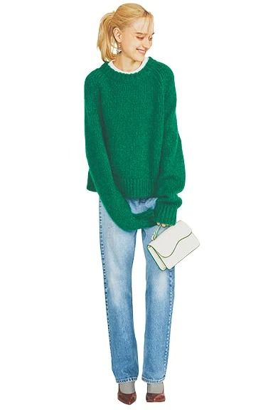ふわふわなグリーンを主役に美形な色落ちブルーで息抜き。高発色が生きるのもふんわりとしたニットの質感ならでは。その発色のよさを突飛に見せないためには、あせたデニムのニュアンスに頼るのがベスト。