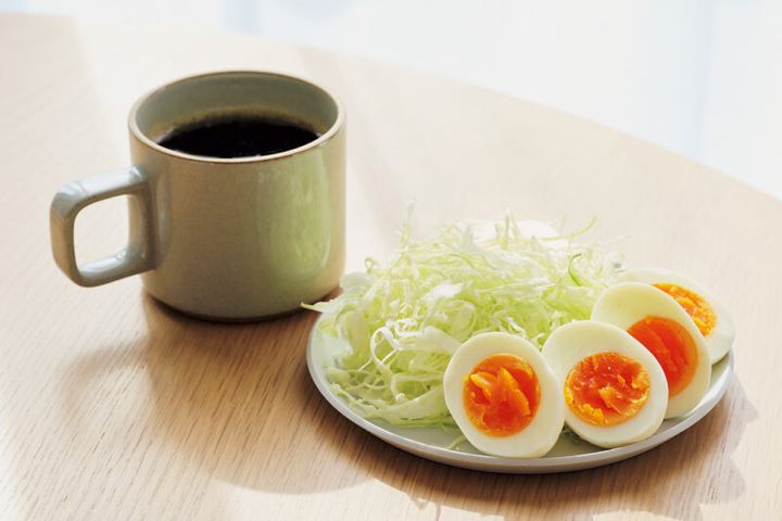 午前中は水分だけ、ランチには完全栄養食品である卵とキャベツを。
